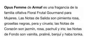 La obra maestra olfativa que celebra la feminidad en su máxima expresión. Esta fragancia femenina de la familia Oriental Floral representa la sofisticación moderna de Armaf. Notas de Salida: bergamota, frutas rojas y especias rosadas despiertan con elegancia vibrante. Notas de Corazón: rosa, jazmín y oud crean un corazón opulento y seductor. Notas de Fondo: vainilla, ámbar y almizcle envuelven en calidez envolvente.