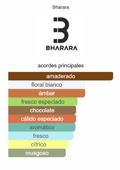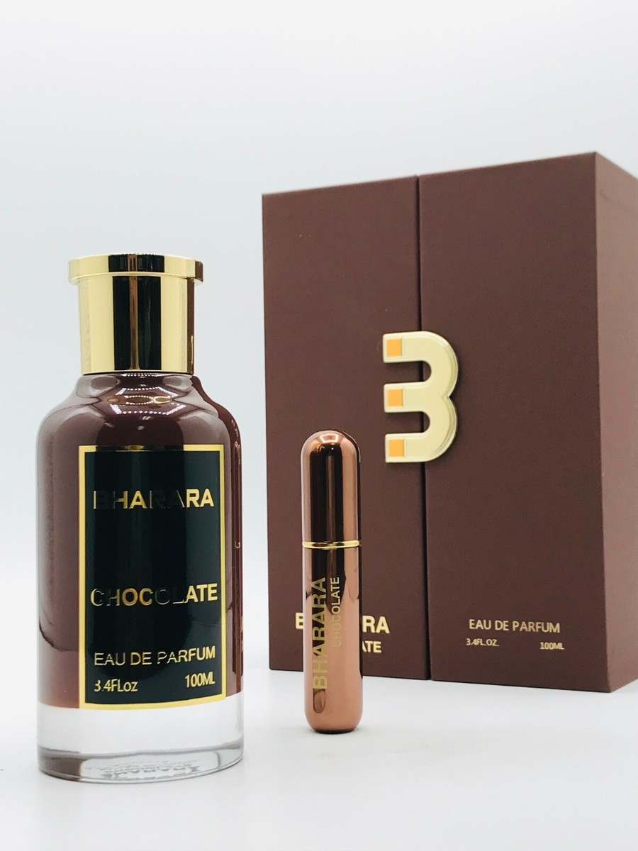 Bharara Chocolate es una fragancia de la familia olfativa Oriental Gourmand para Hombres. Las Notas de Salida son naranja y cardamomo; las Notas de Corazón son chocolate, canela y jazmín; las Notas de Fondo son vainilla, sándalo y ámbar.