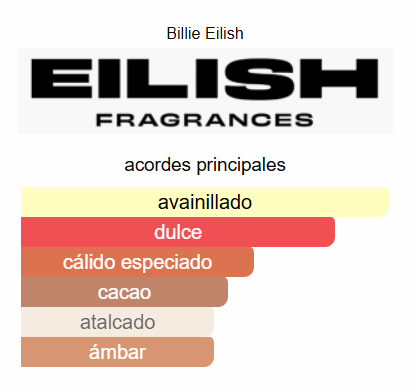 Billie Eilish es una fragancia de la familia olfativa Gourmand Amaderada para Mujeres. Lanzada en 2021. Las Notas de Salida son azúcar y mandarina; las Notas de Corazón son vainilla, rosa y cacao; las Notas de Fondo son sándalo, ámbar y musgo.